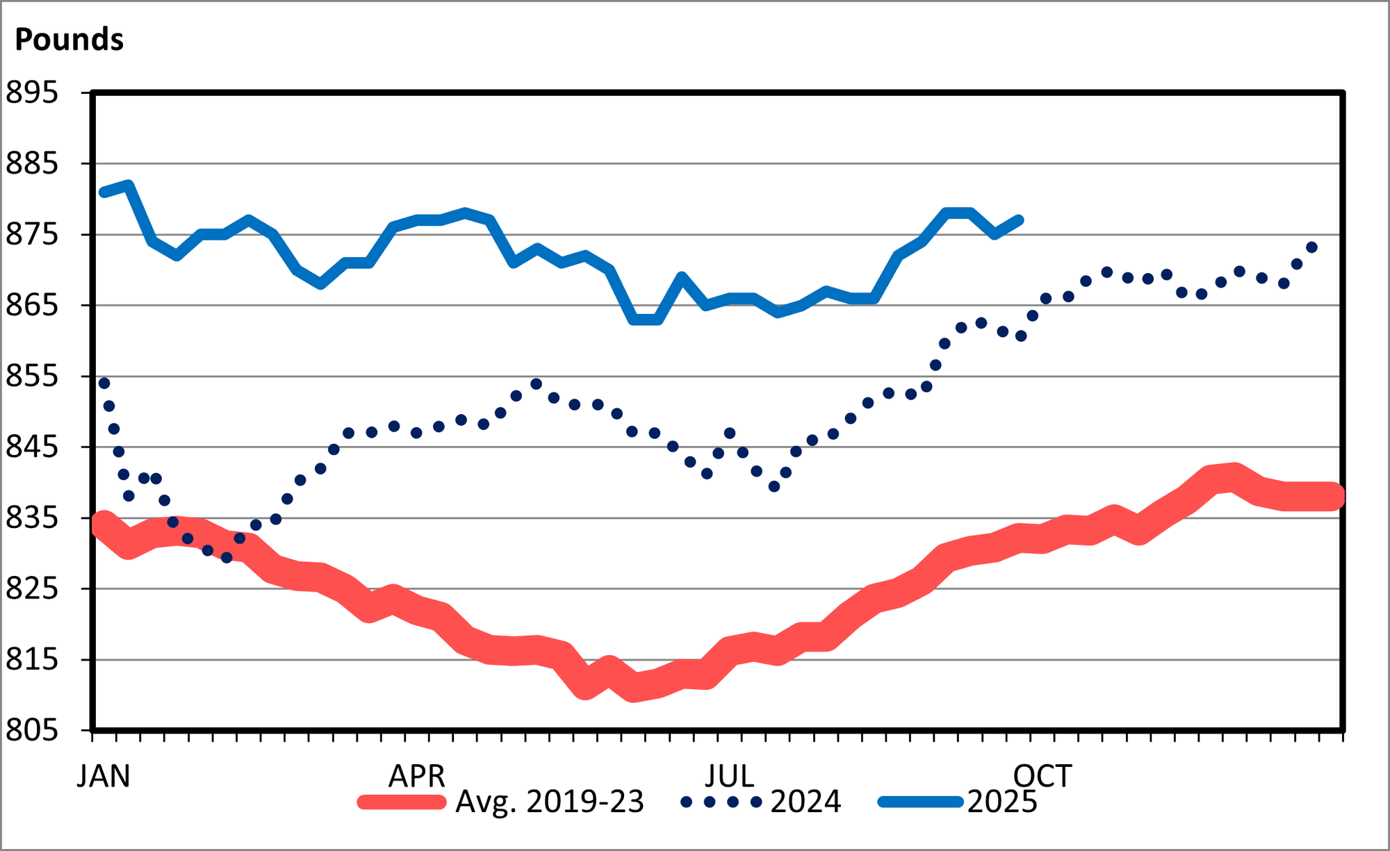 Low discounts on heavy carcasses by packers has allowed this continue with packers willing to harvest fewer cattle at higher weights which has caused total beef production to remain similar to 2024 YTD. Cattle weighing 900-1000 lbs., 1000-1050 lbs., and over 1050 lbs. are currently being discounted approximately $1 , $4, and $15 per cwt, respectively. These discounts have remained constant within the last 4 years. For carcass weights to change, grid discounts would need to increase, and corn would have to remain cheap as feeder cattle prices will certainly be higher into the future.