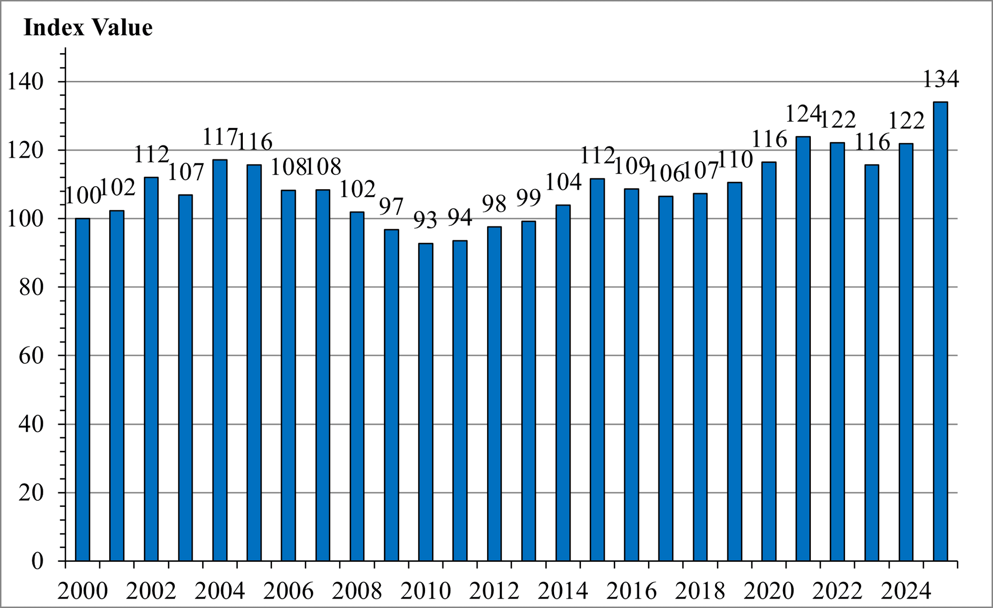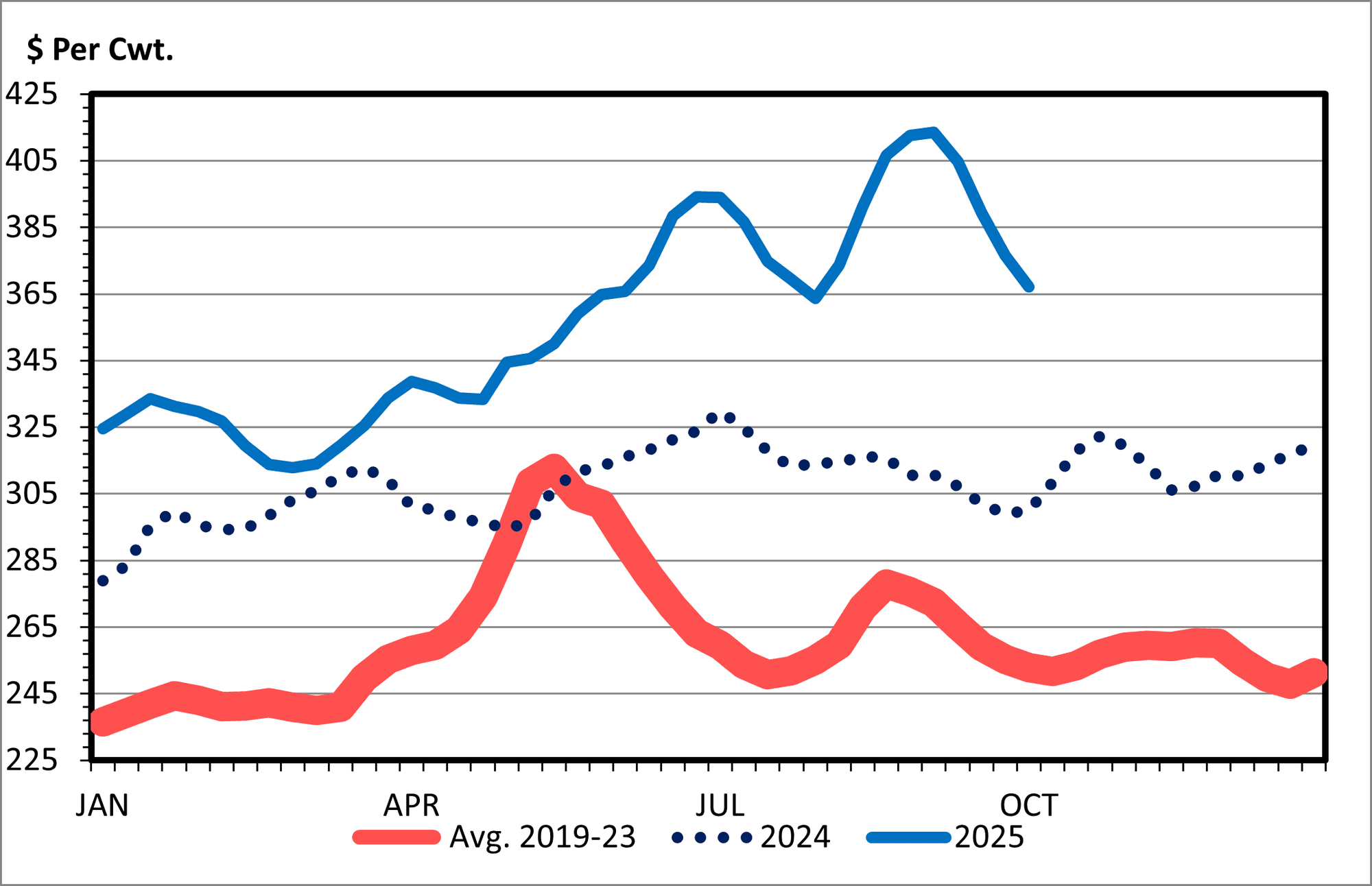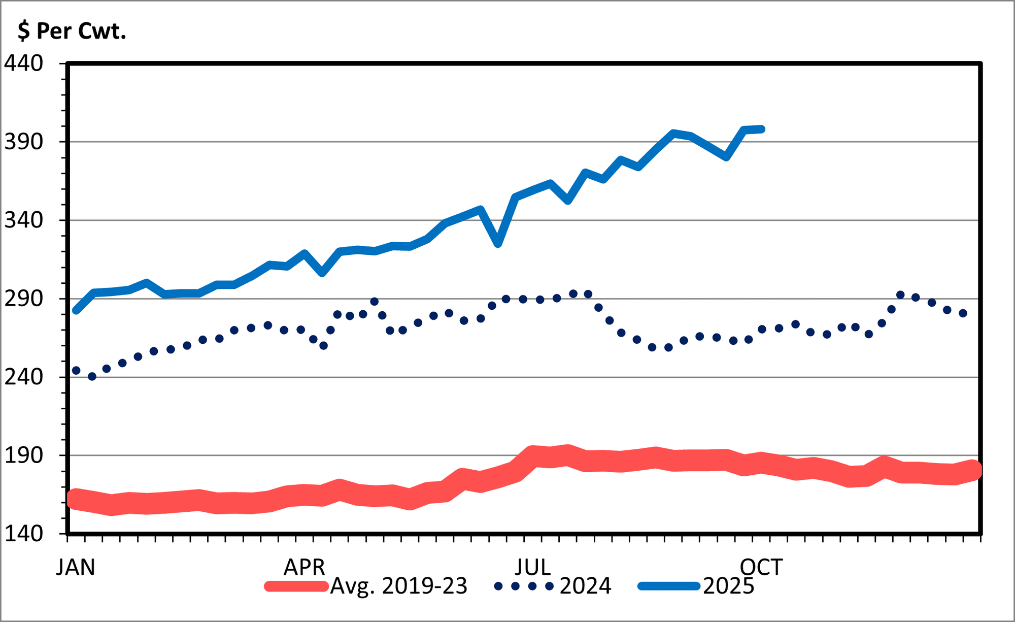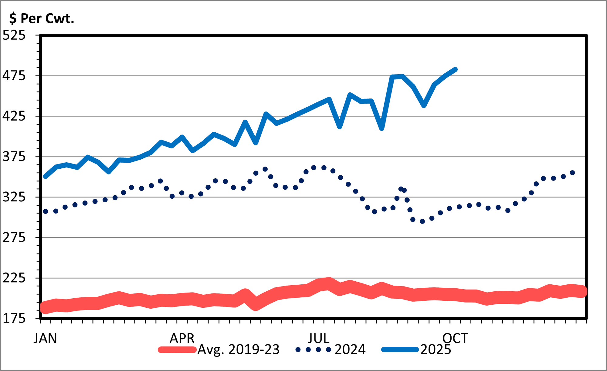 For example, in Q2 beef demand was 134 meaning that beef demand was 34% higher in 2025 than in 2000. Comparing this high over other years and Q2-2025 was the highest demand ever recorded by nearly 10%. This has largely been a function of constant consumption but at higher prices. This change has some questioning whether we are entering a new phase of U.S. consumer demand where own prices matter more than cross competing commodity prices such as those for pork and chicken. Consumers have been the shining star thus far in 2025.