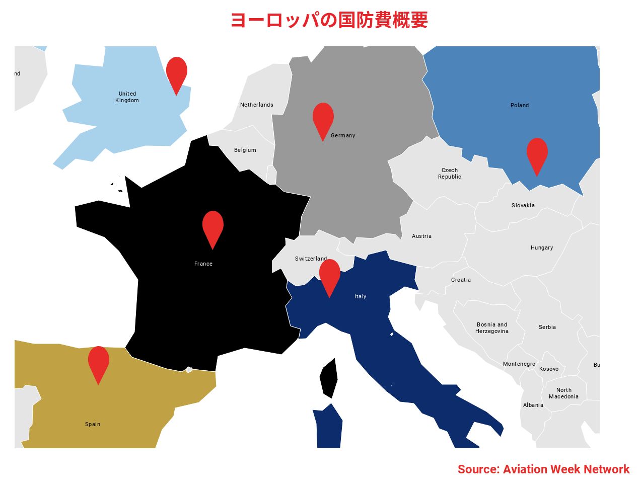 ヨーロッパでは主要国の多くで国防費が増加しており、短期的には堅調な見通しだが、財政再建にはまだ着手していない。