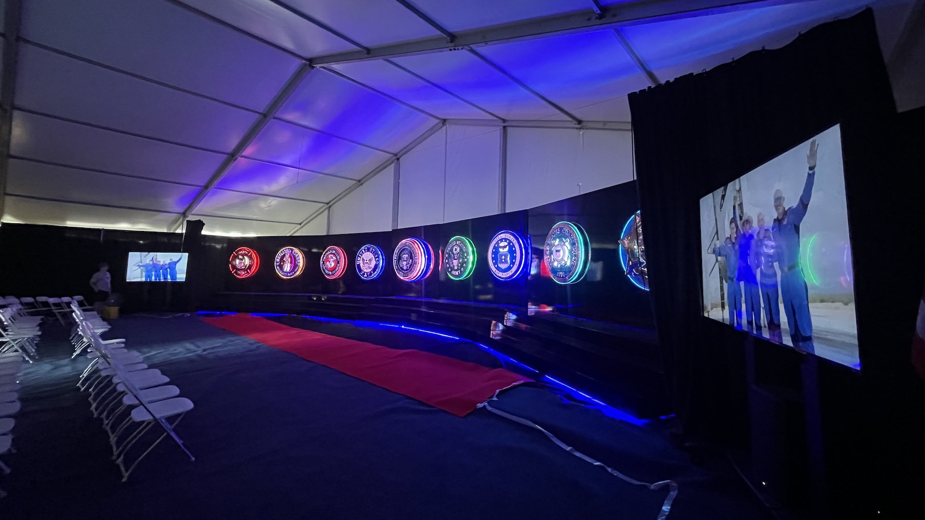 The nine seals recognize active military, police, first responders and veterans. Each seal is made of hundreds of pieces of stainless steel, powder coated with paint and welded together in multiple layers. The seals are mounted on acrylic glass with LED lighting.