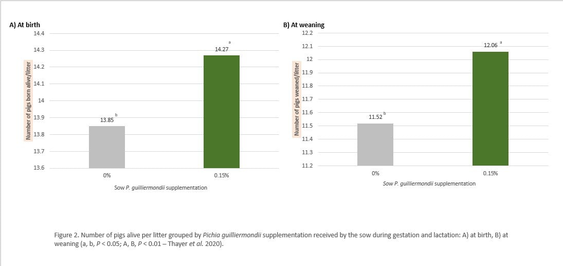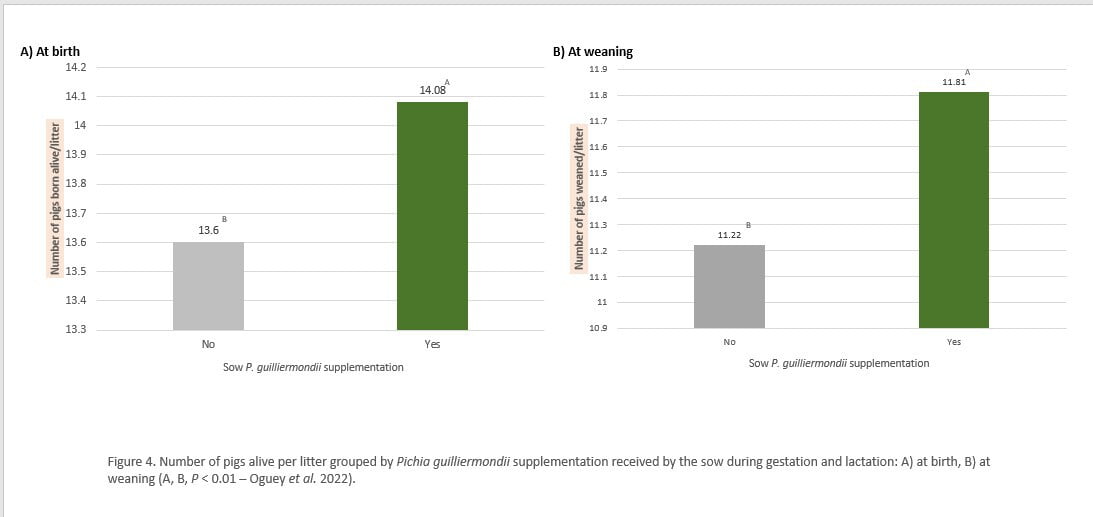 References: 1. Peisker M, Stensrud E, Apajalahti J, et al. Morphological Characterization of Pichia guilliermondii and Saccharomyces cerevisiae Yeast and their Effects on Adherence of Intestinal Pathogens on Piglet and Chicken Epithelium In-vitro. Journal of Animal Research and Nutrition 2017;2. 2. Bass B, Perez V, Yang H, et al. Impact of a whole cell yeast product on sow and litter performance. Journal of Animal Science 2012;90:49. 3. Bass BE, Tsai T-C, Yang H, et al. Influence of a whole yeast product (Pichia guilliermondii) fed throughout gestation and lactation on performance and immune parameters of the sow and litter. Journal of Animal Science 2019;97:1671-1678. 4. Thayer MT, Garcia RM, Duttlinger AW, et al. Feeding a whole-cell inactivated Pichia guilliermondi yeast to gestating and lactating sows in a commercial production system. Journal of Animal Science 2020;98:99-100. 5. Janvier E, Oguey C, Samson A. Dietary supplementation with Pichia guilliermondii yeast product during gestation and lactation improves sows’ body condition and litter performance. 15th International Symposium on Digestive Physiology of Pigs. Rotterdam, The Netherlands, 2022.