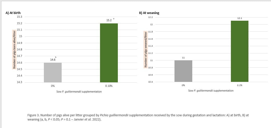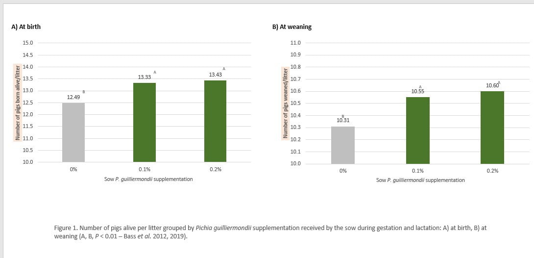 By Sarah Cooper, Morgan Thayer and Clémentine Oguey Profitability in swine production depends on efficiency achieved by the operation. Producers, nutritionists and veterinarians are thereby motivated to investigate novel technologies that can help boost productivity and efficiency. Such technologies include non-drug specialty feed ingredients that help to maintain animals in optimal physiological status and consequently provide productivity benefits. For farrow-to-finish or feeder pig producers, litter size and weaned pig output are economic parameters of critical importance. Any favorable impacts of a cost-effective, specialty feed ingredient on these parameters would be advantageous for elevating efficiency and profit potential. P. guilliermondii is a novel yeast with unique morphology, structure and consequent activity1. A series of three key peer-reviewed studies involving P. guilliermondii have been performed in sows over the past several years in both research and commercial facilities in the US and Europe, and more recently, a meta-analysis was fulfilled. Results demonstrate that supplementing the gestation and lactation diets of sows and gilts with an inactivated Pichia guilliermondii-based specialty feed ingredient promotes improved sow reproductive parameters related to fecundity and piglet vitality. Pichia supplementation initially demonstrates an impact on sow reproductive performance in a university research facility2,3 An initial study was set up by the University of Arkansas in their research facilities. It involved 98 Dekalb-Monsanto Line GPK 35 gestating sows and gilts. Within 24 hours of breeding, the sows and gilts were assigned to one of three dietary treatment groups based on body weight and parity. The dietary treatments included 1 - a basal diet (control, 0%), 2 - the basal control diet supplemented with 0.1% P. guilliermondii, or 3 - the basal control diet supplemented with 0.2% P. guilliermondii. These dietary treatments began at breeding and were fed consistently through gestation and lactation. The sows and gilts were housed in individual gestation stalls and provided approximately 2.3 kg (5 lbs) of feed per day with ad libitum access to water. On day 110 of gestation, the sows and gilts were moved to individual farrowing crates. Following farrowing, the sows and gilts were started on a lactation diet, offered ad libitum, with the same supplementation as added in gestation until weaning, at 21 days after farrowing. Cross-fostering was performed within treatment groups and completed by 24 hours post-farrowing. Notable results in this study included: More pigs born and weaned Sows and gilts supplemented with P. guilliermondii farrowed 6.7 – 7.5% more live pigs compared to animals receiving no supplementation (P < 0.01; Figure 1).
