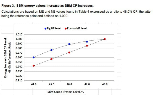 SBM amino acid and energy (ME, NE) content for poultry and pigs was expressed relative to SBM protein level over the 44.0 to 48% range since both increase as SBM and CP increases.