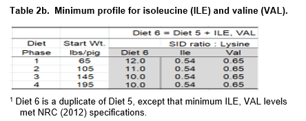As noted for the previous growth period (65 to 145 lbs.), the addition of Ile and Val to diet 6 did not restore growth or FCE to the control level (Diet 1 vs 6; P<0.002), despite levels in Diet 5 appearing to be marginally deficient (SID 0.488%, 0.625% respectively). Assuming that the NRC minimum for the SID histidine to lysine ratio is correct (0.344), it would not have been a limiting factor (Diet 5, 0.37%; Table 3b).