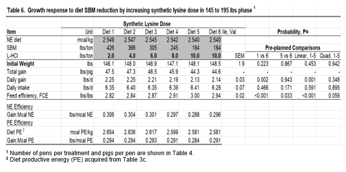 This report details the results of the SL dose response study (Zier-Rush et al., 2013a) that we conducted when synthetic tryptophan use in swine diets was becoming routine and when valine (Val) and isoleucine (Ile) were close to the price threshold needed for commercial use. Extensive use of DDGS and corn germ meal (CGM) had become routine in the Hanor system (IL region). These ingredients reduced dietary SBM content to levels that had not been seen since the 1970’s.