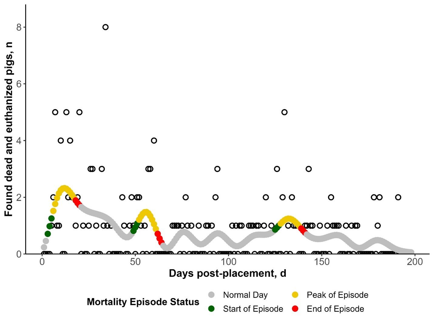 Using statistical models to define mortality episodesDuring my Ph.D. program at the University of Missouri - Columbia, under the supervision of Jared Decker, and in collaboration with The Maschhoffs, LLC, Summit Smart Farms and Boehringer Ingelheim, we developed a novel statistical method to identify mortality episodes in commercial wean-to-finish pig barns (Grohmann et al., 2024). Mortality episodes can be defined as sequences of days (typically 5 to 21 consecutive days) where acute, sustained mortality exceeds expectations for a given age within a group of pigs.